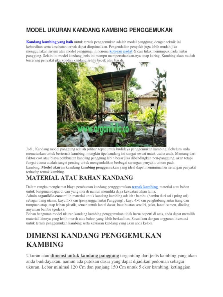 Bentuk kandang kambing domba itu berbeda, baik ukuran luasnya, tinggi rendah tempat pakan, dan lainnya, yang. Jarak tersebut untuk memudahkan peternak dalam membersihkan dan mengumpulkan kotoran yang jatuh. Untuk membuat kandang kambing yang perlu diperhatikan adalah: Material kandang didominasi dengan bahan. Manfaat sinar matahari adalah bisa membunuh bakteri.
